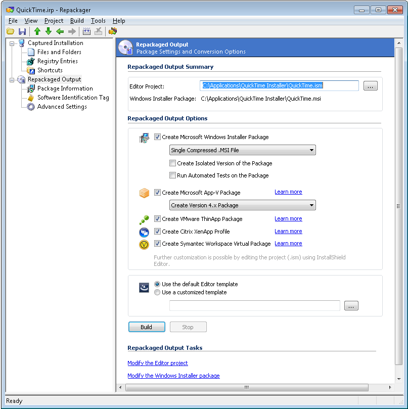 - A project template contains all of the default settings and design elements that you want to use as a starting point when you create an installation project. In the Repackaged Output Options area, select the InstallShield Editor Project Template you want to use when creating the project: