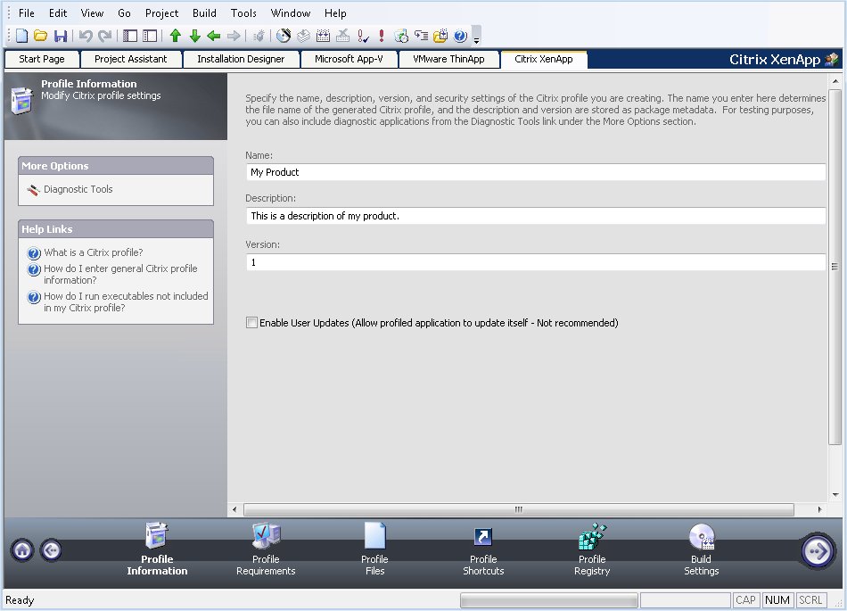 On the Profile Information page in the Citrix Assistant , you specify the Name , Description , and Version of the Citrix profile you are creating. This page is also where you specify whether users can update applications.
