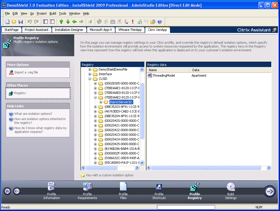 On the Profile Registry page, you can view existing registry items, and add or delete registry items. You can also override the Citrix default isolation options for a registry key. Isolation options specify how the isolation environment will provide access to system resources requested by the application.