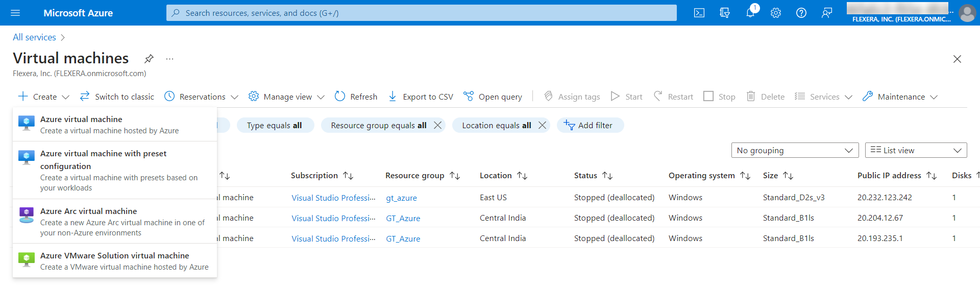 2. From the list of available Azure services, choose Virtual Machines . The Virtual Machines page appears.