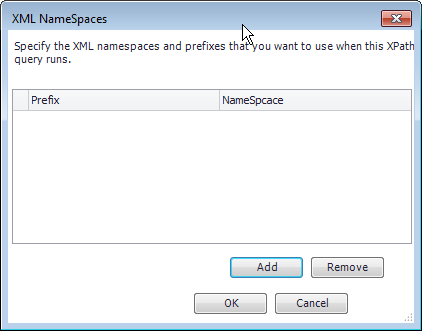 | Add | Click to open the Add XML Namespace dialog box, where you are prompted to enter a Prefix and Namespace for an XML namespace. |