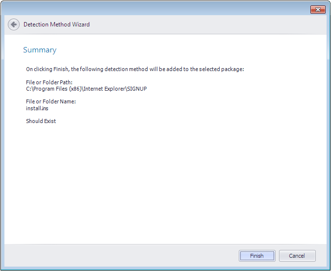 On the Summary panel, a summary of your selections is listed. Click Finish to add the Detection Method to the list.