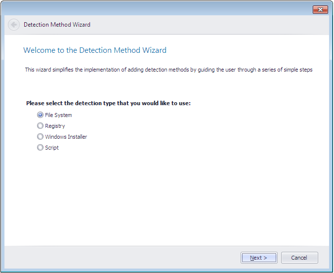 On the Welcome panel, you select the type of the detection method that you are adding: file system, registry, Windows Installer, or script.