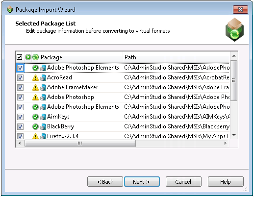 - On the Selected Package List panel, an icon in the Virtualization Readiness column identifies whether the package requires repackaging prior to conversion to a virtual application: