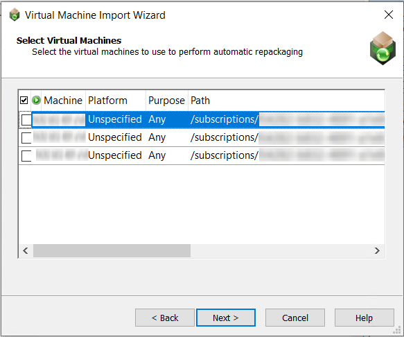 1. In the Select Virtual Machines panel, select the virtual machine images that you want to use to perform automated repackaging.