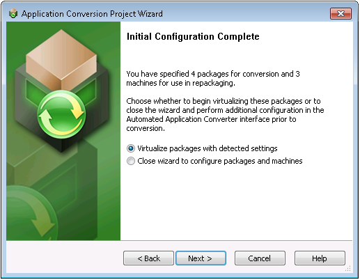 The Initial Configuration Complete panel lists the packages and machines you have selected to add to your project. You can choose to either begin conversion or to close the wizard so that you can perform additional configuration of these packages and machines prior to conversion.