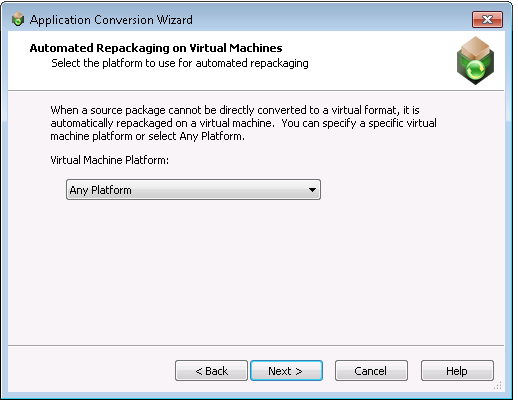 - Any Platform—The Automated Application Converter will use any of the virtual machines that you have selected on the Machines tab to perform automated repackaging, regardless of platform.