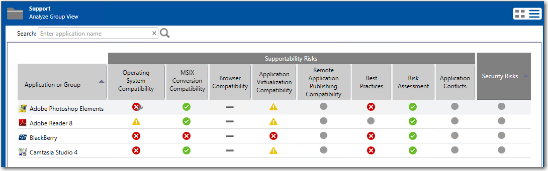 5. When issue resolution and reimporting is complete, look at the Analyze Group View , Application View , or Deployment Type View of the package, application, or group that you tested. You will see that the Error With Fix and Warning With Fix icons have been replaced with the status icon with the next highest level (as described in Hierarchical Level of Status Icons) in that test category.